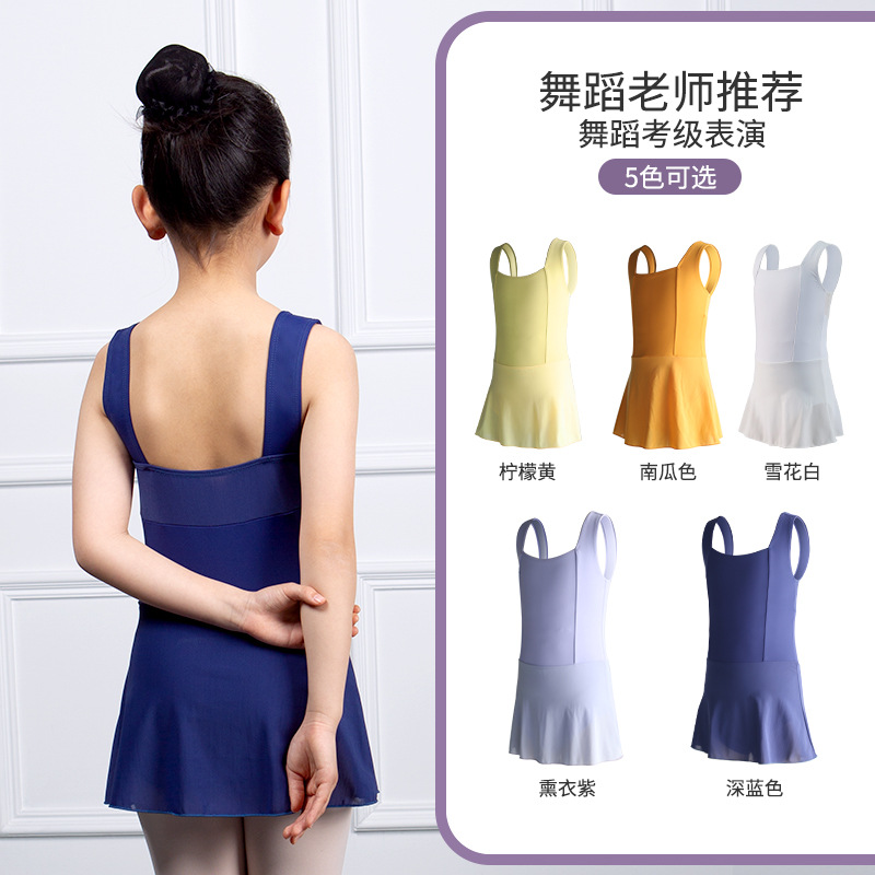 Pakaian tari tali bahu lebar anak-anak, rompi pakaian satu potong, pakaian latihan balet, pemeriksaan seni profesional, rok jala untuk wanita