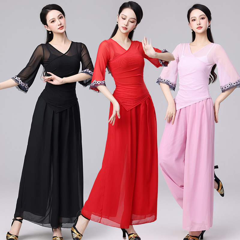 Pakaian dansa balet wanita dewasa, baju latihan tari China, baju latihan lengan benang atas