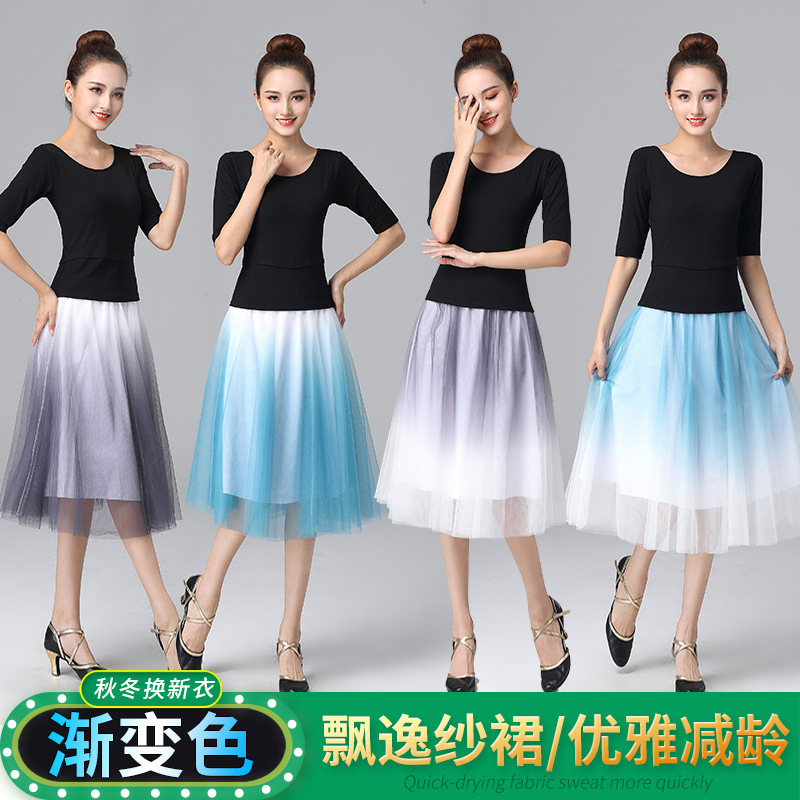 Pakaian dansa persegi Modern, pakaian latihan dasar rok gradien jaring baru, pakaian pertunjukan dansa dewasa