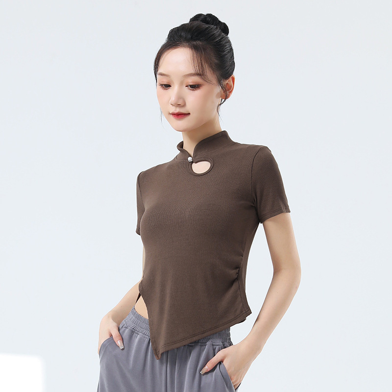 Baju dansa dewasa lengan pendek, pakaian dansa etnik Tiongkok Klasik, pakaian latihan atasan kerah China, baju retro lengan pendek, pakaian dansa dewasa