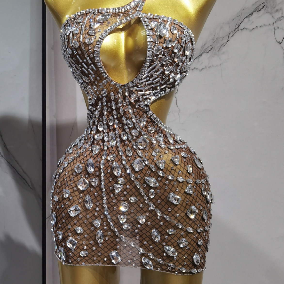 秋季上新单肩奢华亮钻露背包臀裙鸡尾酒派对酒吧乐队女歌手服装