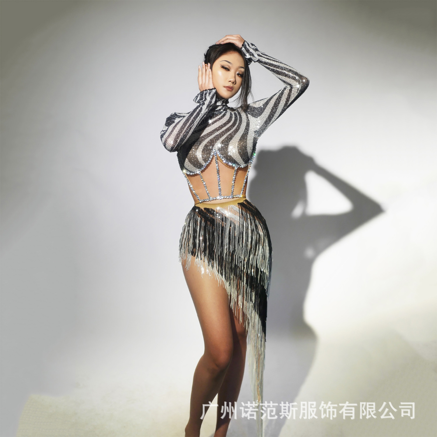 Kepribadian zebra pola jalan berlian imitasi bergaris hitam putih rumbai lengan panjang pakaian tari Latin tema pesta