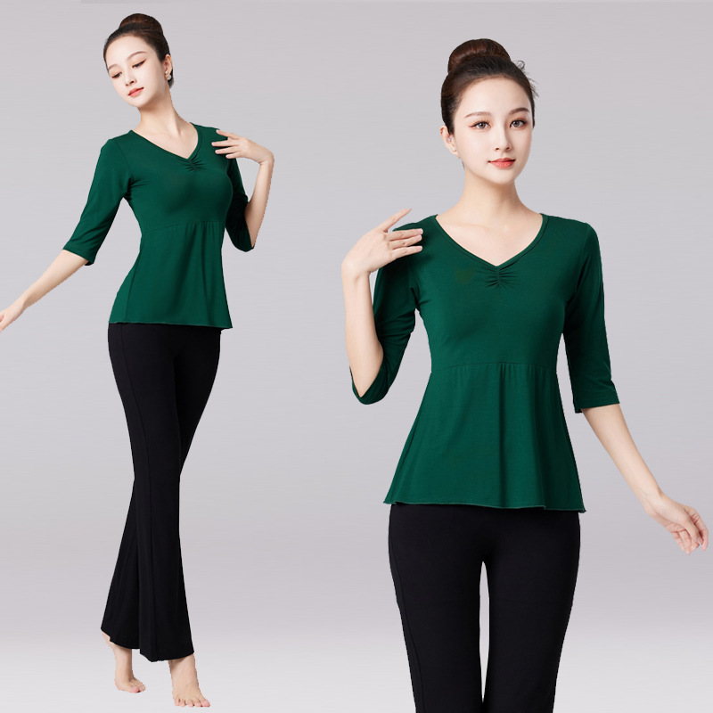 Pakaian dansa longgar hijau tua, baju latihan tari modern leher V, pakaian latihan dansa Latin, jam tangan yoga