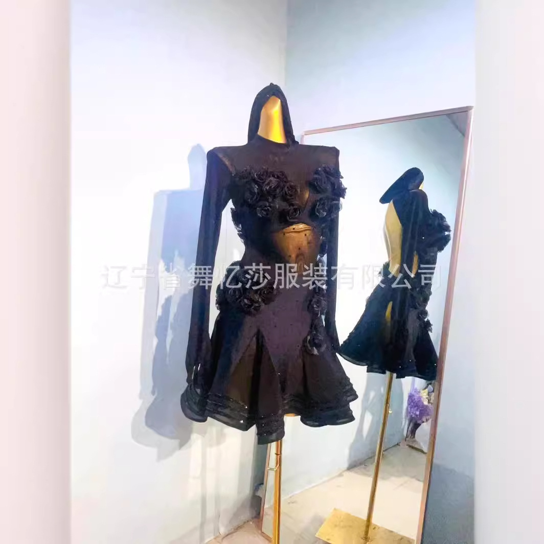 新款拉丁舞演出服比赛连衣裙专业舞蹈台流苏蕾丝黑色花服艺考服