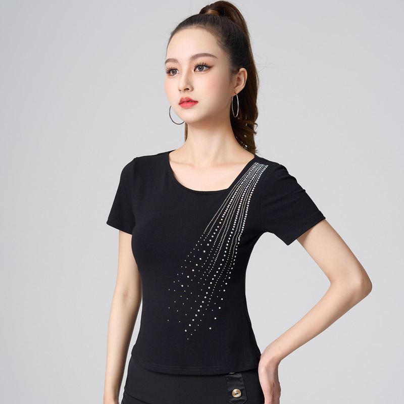 Baju Atasan Slim Fit Tari Latin Pakaian Wanita High-end Pakaian Tari Modern Kaos Musim Panas Lengan Pendek Berlian Panas Berolahraga Bergaya Nasional S7