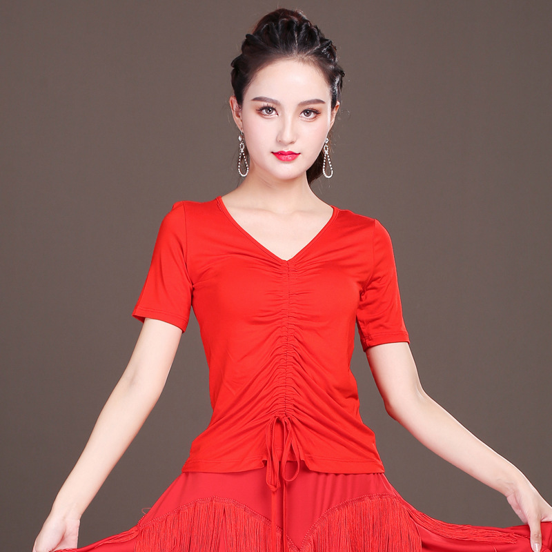 Sepatu dansa merah pakaian dansa modern wanita dewasa lengan pendek simpul bunga hem bersimpul silang musim panas baju latihan dansa atasan 3516