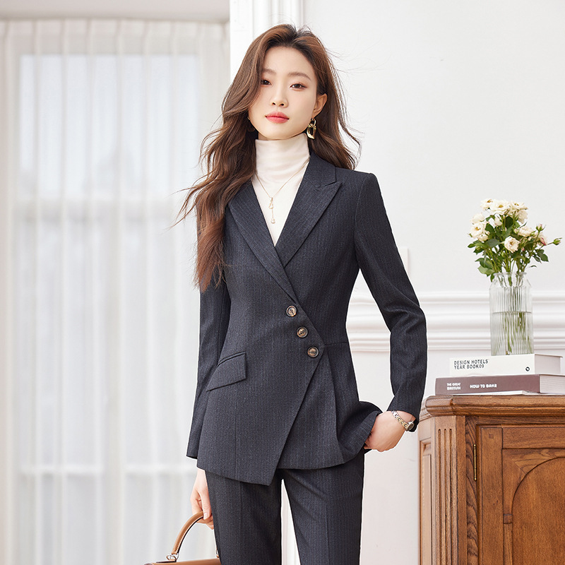 Setelan jaket abu-abu untuk wanita, pakaian formal profesional kelas atas Musim Semi dan Gugur 2023, setelan bergaris temperamen
