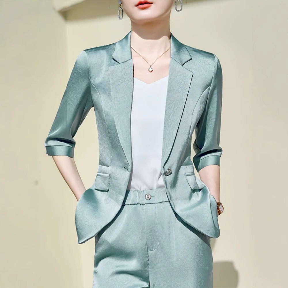 Jaket Setelan Jas Lengan 7/4 Lengan Pakaian Kerja Profesional Model Tipis Musim Semi dan Musim Panas Wanita Jaket Setelan Pakaian Satin Asam Asetat Warna Biru