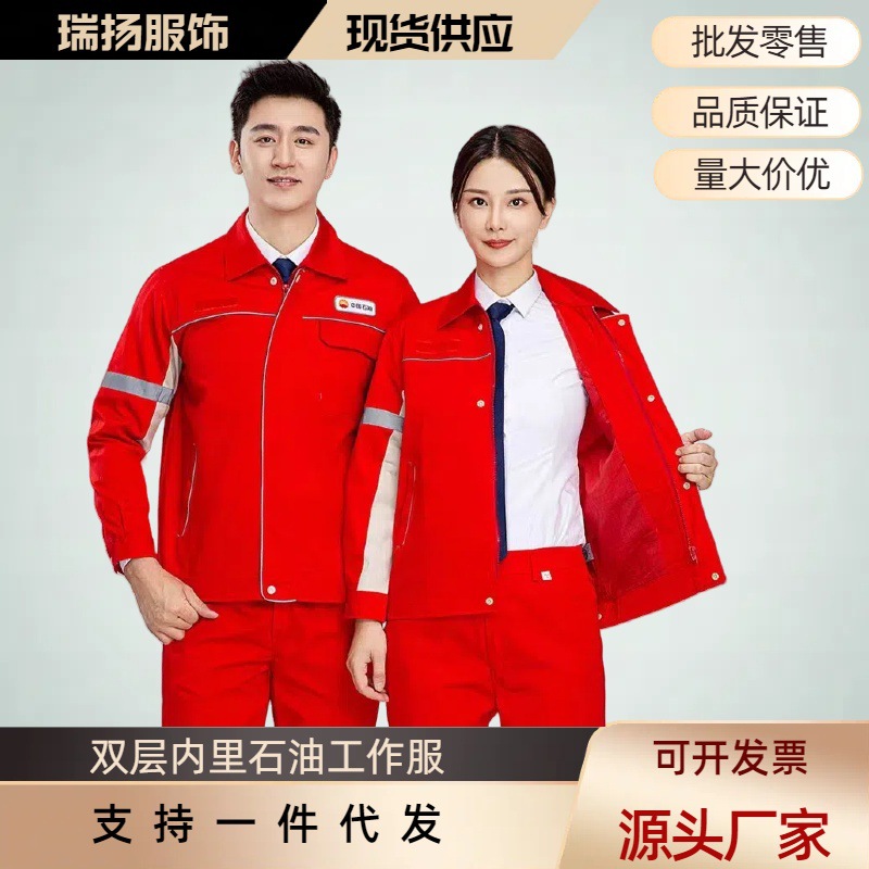 Set Pakaian Kerja Anti Statis PetroChina Musim Semi dan Musim Gugur Baju Atasan Lengan Panjang Pria Pakaian Kerja Bahan Bakar Reflektif Strip Lapisan Ganda