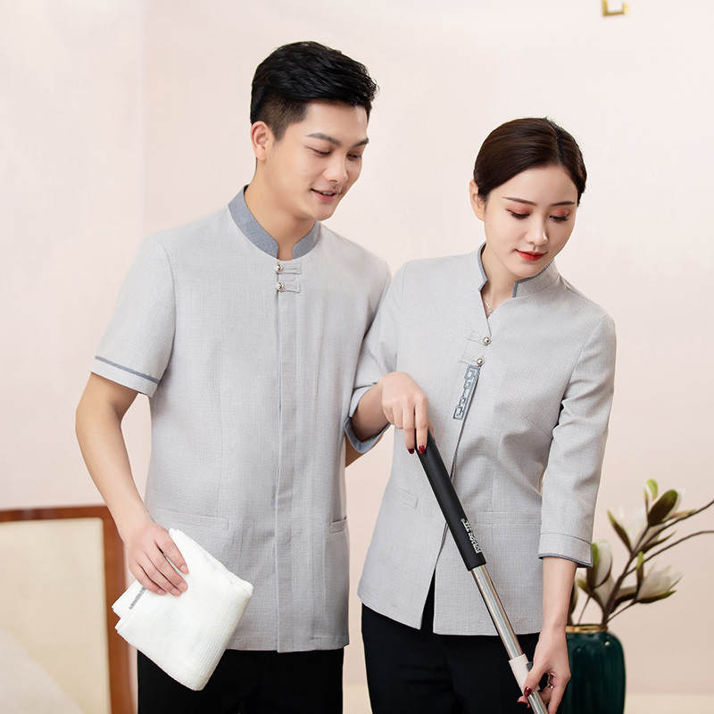 Hotel kain Cina kain gesper abu-abu muda pakaian kerja pembersih lengan pendek properti penjualan departemen pembersih bibi wanita musim panas pria