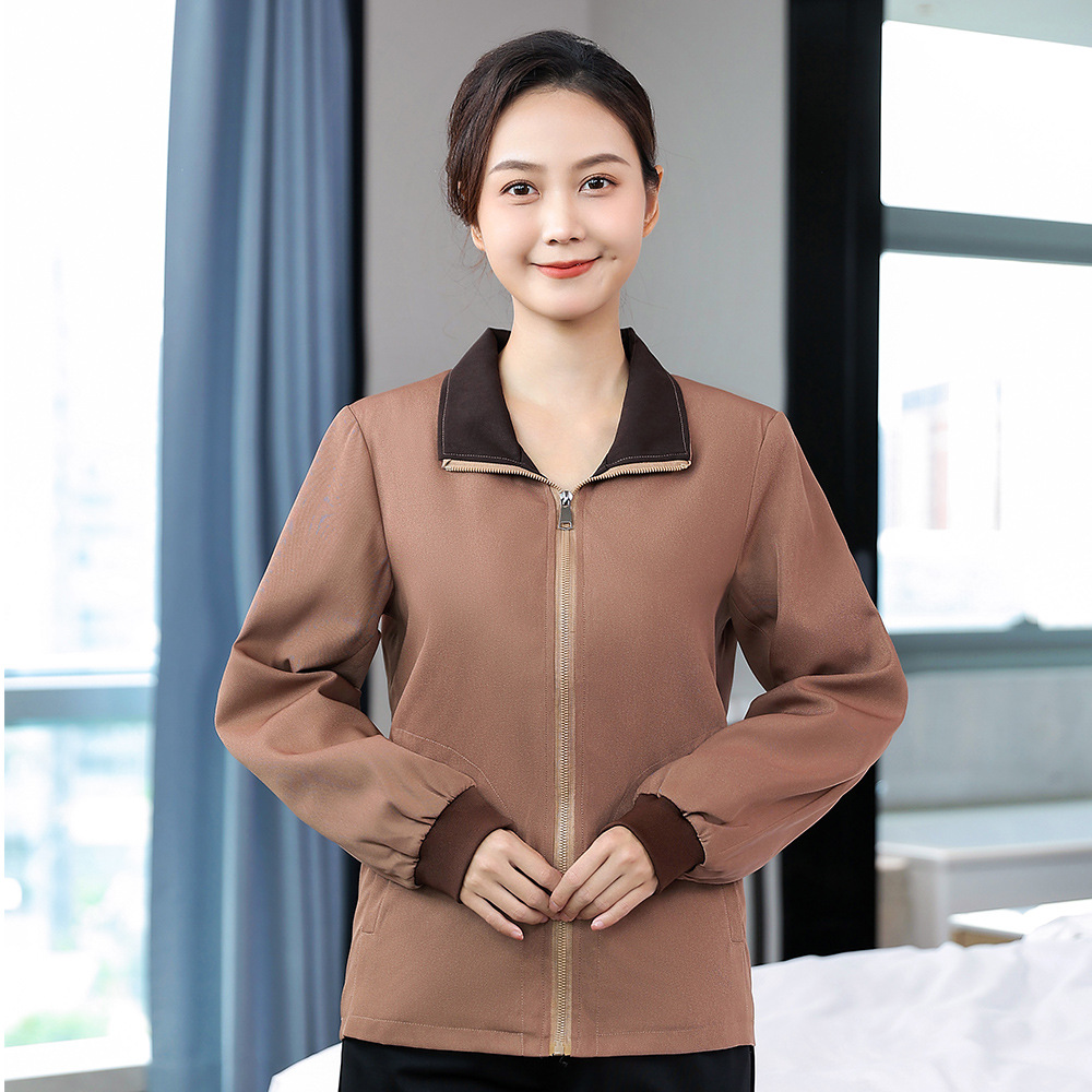 Pakaian kerja pembersih Hotel lengan panjang, pembersih rumah tangga kamar hotel, properti bibi PA, ritsleting, pakaian kerja logo cetak