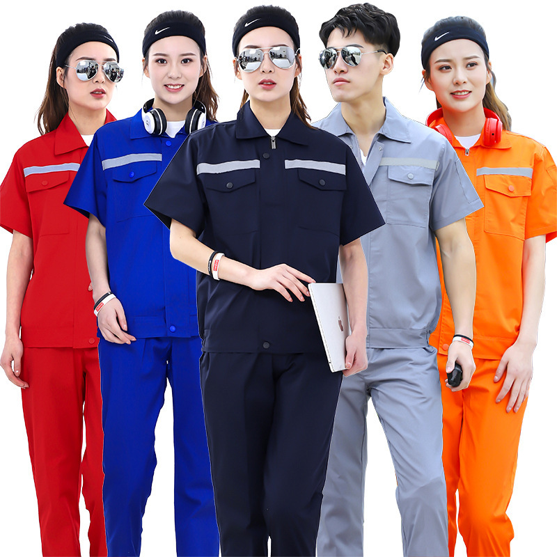 Setelan Pakaian Kerja Lengan Pendek Musim Panas Pria Wanita Atasan Pakaian Pekerja Teknik Perbaikan Otomatis Pakaian Pabrik Pembersihan Properti Model Tipis Tembus Udara