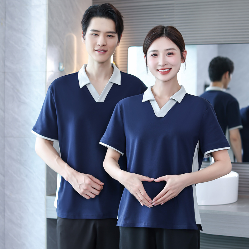 Pakaian kerja pembersih properti perumahan kaus kerah V pria dan wanita musim panas lengan pendek pembersih ruang tamu hotel rumah sakit bibi pembersih