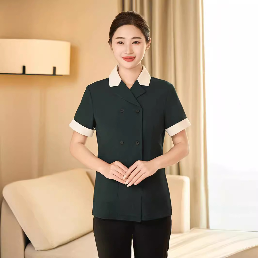 Pakaian kerja pembersih Hotel, properti pakaian pembersih hotel lengan pendek musim panas untuk Hotel pembersih ruangan bibi lengan pendek
