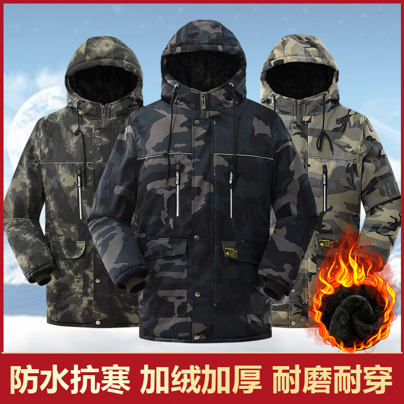 Kamuflase mantel berbantalan katun untuk pria, mantel musim dingin berlapis bulu domba tebal tahan dingin warna hijau tentara, mantel perlindungan kerja empuk katun dengan bantalan
