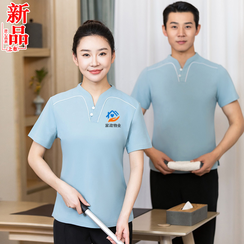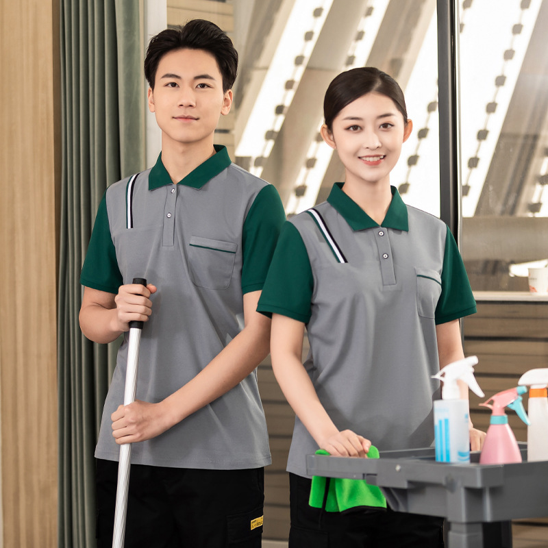 Hotel properti Mall musim panas lengan pendek pakaian kerja pembersih T-shirt bersirkulasi pakaian kerja bibi pembersih ruangan kantin