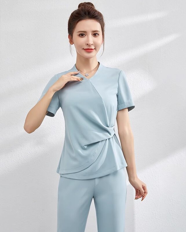 Pakaian kerja salon kecantikan wanita, setelan guru pilih telinga untuk teknisi kecantikan ruang kesehatan terapi kaki mandi kaki baru musim panas