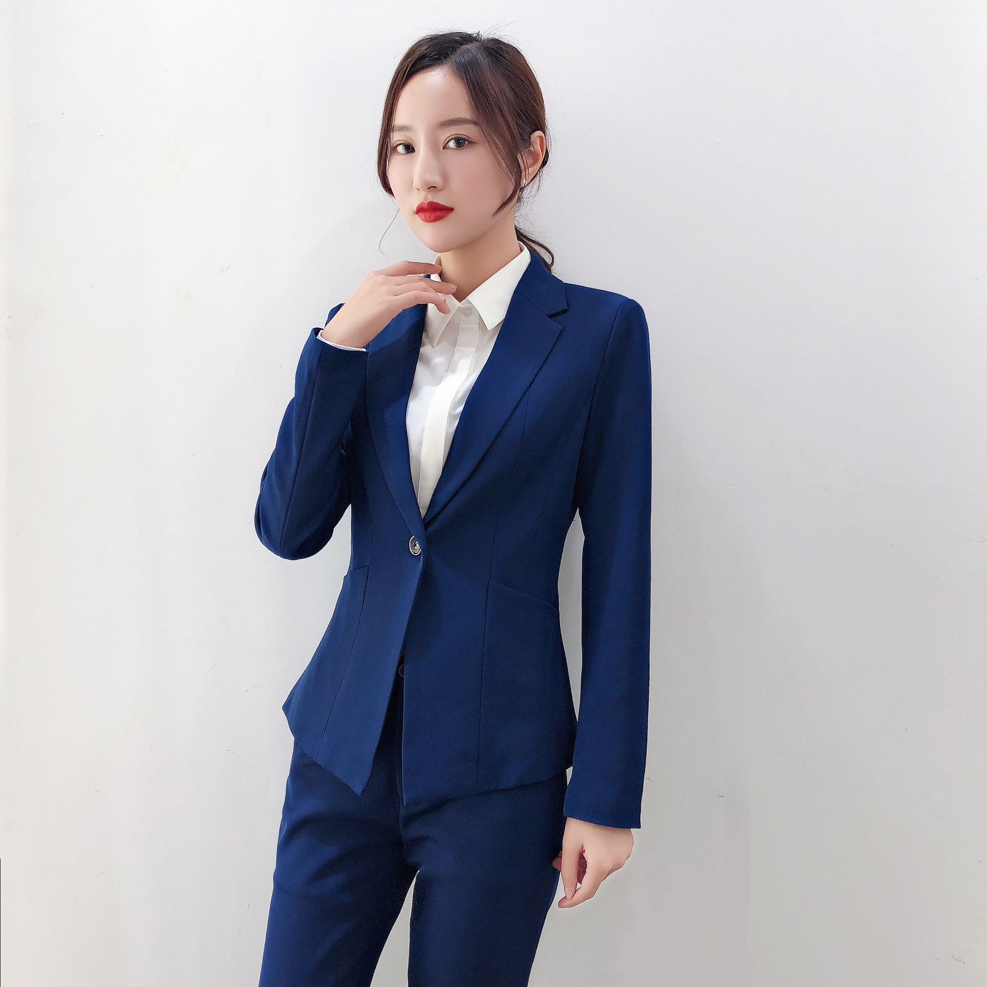 Setelan Pakaian Komuter Elegan Profesional Setelan Pakaian Lengan Panjang Biru Model Baru Musim Semi Pakaian Kerja Ahli Kecantikan Meja Depan Hotel