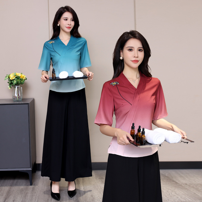 2022 baru pakaian kerja teknisi pijat kaki wanita toko pijat kaki Pusat Kesehatan setelan bordir kaki lebar pakaian kerja temperamen setengah lengan