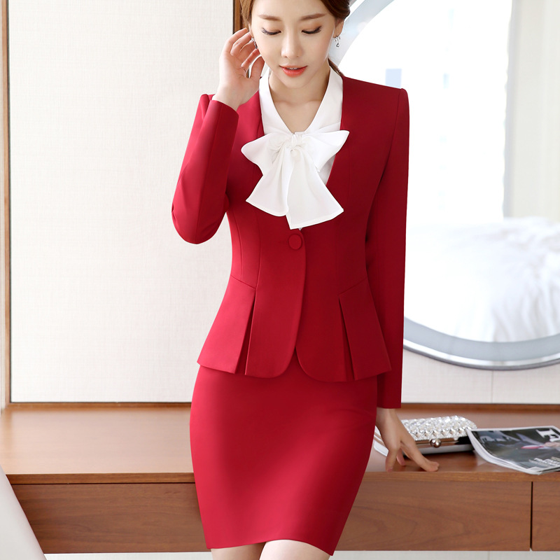 Setelan bisnis merah pakaian kerja kecantikan rok wanita setelan dua potong palsu mode hotel meja depan lengan panjang