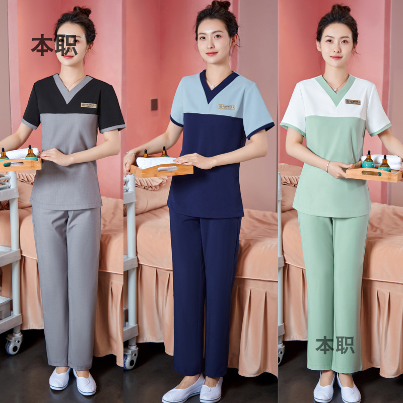 Pakaian Mandi Kaki Kecantikan Medis SPA Teknisi Pusat Kesehatan Peregangan Model Tipis Lengan Pendek Musim Panas Pakaian Kerja Guru Salon Kecantikan Wanita