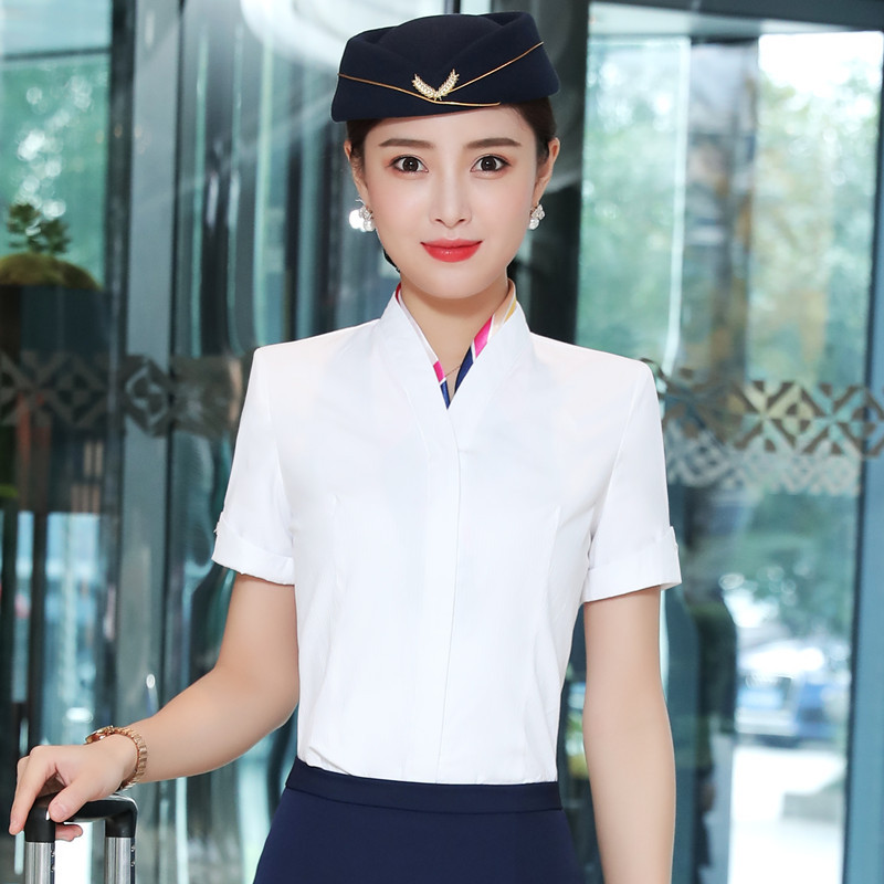 Kaus putih lengan pendek elegan leher-v kemeja ahli pakaian kerja pakaian kerja ol pramugari kru kecepatan tinggi baju kerja Wanita Atasan