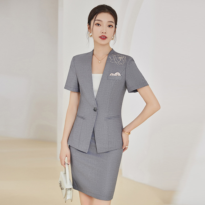 Toko perhiasan cantik setelan baju kerja profesional pakaian wanita dewi kipas hotel meja depan musim panas rok setelan lengan pendek