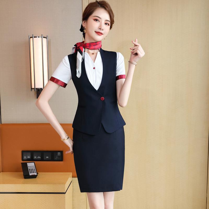Gaun tiga potong rompi profesional pakaian kerja meja depan hotel musim panas wanita pakaian kerja etiket siswa pakaian latihan ahli kecantikan