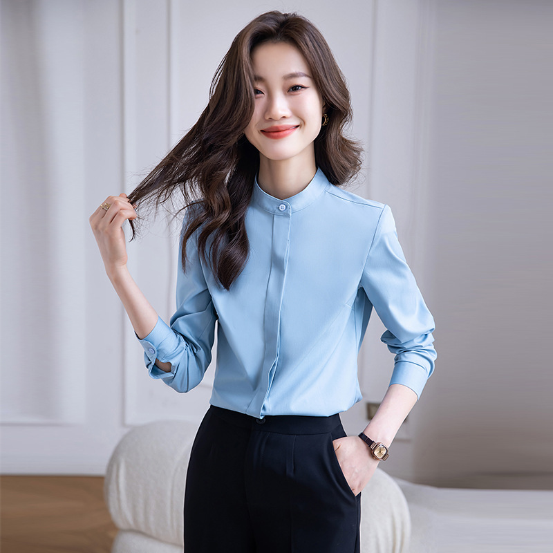 Kemeja warna Solid atasan wanita 2023 kerah berdiri baru pakaian kerja satin temperamen mewah kemeja pelangsing pakaian kerja ahli kecantikan