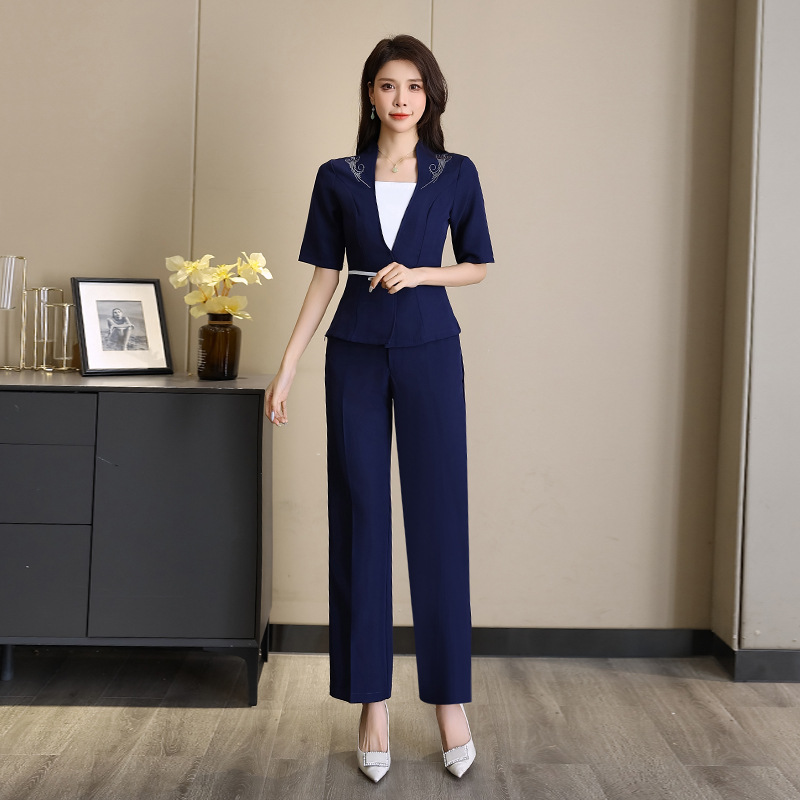 Setelan Jas Lengan Pendek Profesional Pakaian Kerja Ahli Kecantikan Elegan Musim Panas Pakaian Kerja Resepsionis Hotel Gaun Set Wanita