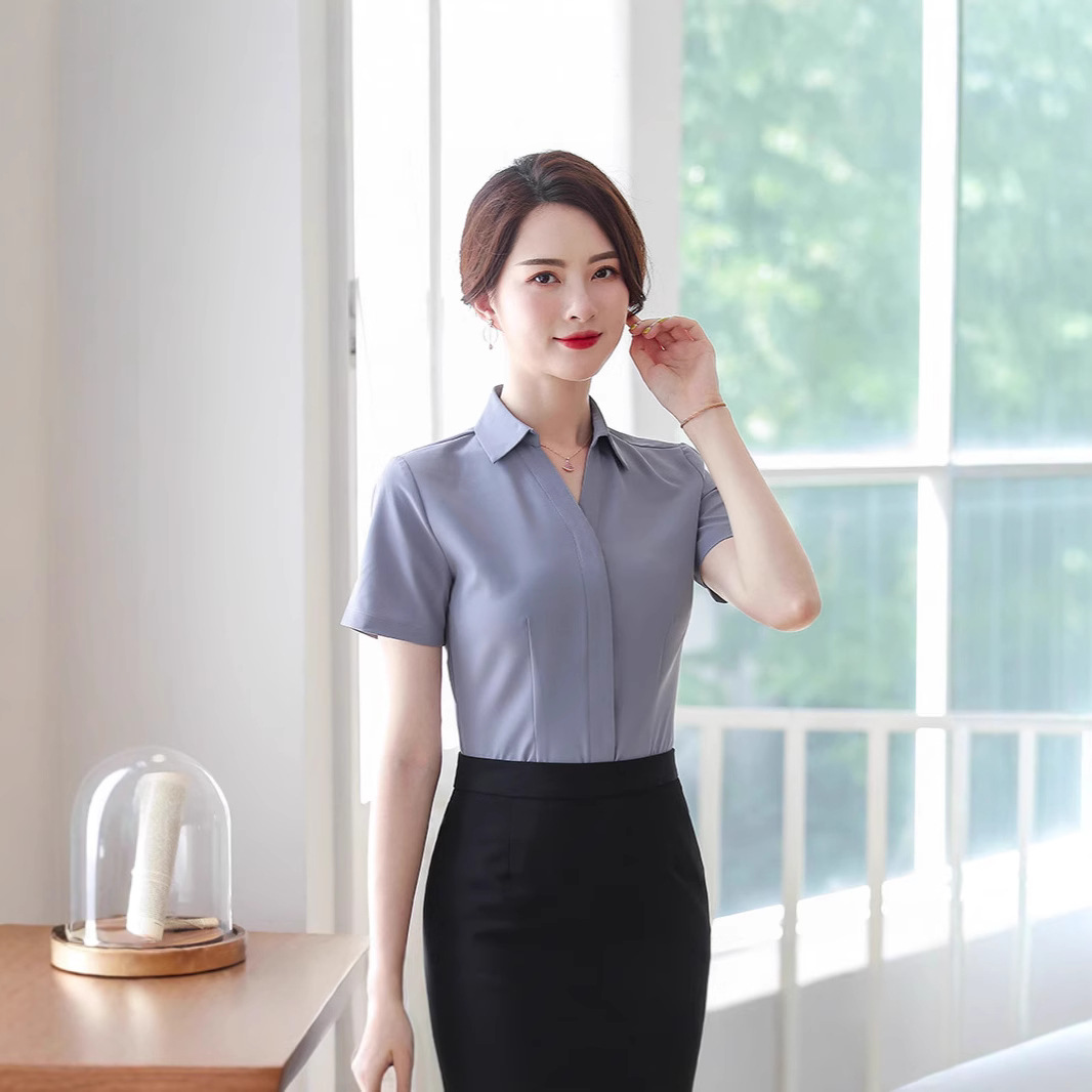 Kemeja Profesional Kerah V Pakaian Kerja Meja Depan Warna Putih Kemeja Musim Panas Lengan Pendek Ahli Kecantikan Toko Perhiasan Sifon Musim Semi Musim Panas Wanita
