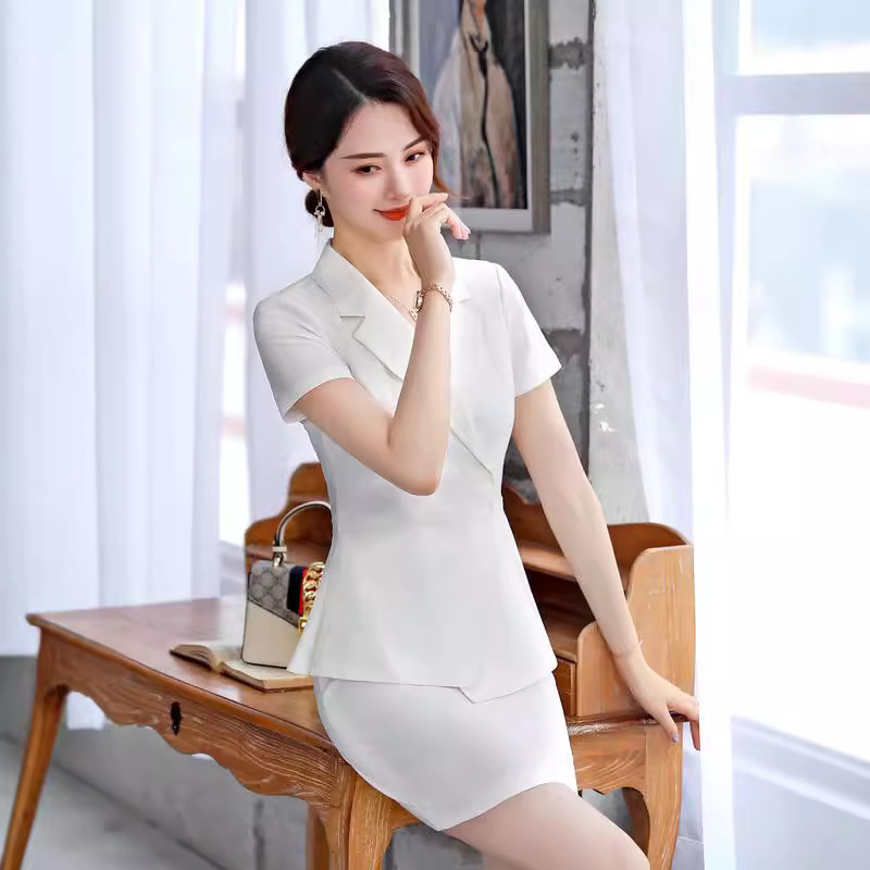 Setelan pakaian bisnis wanita lengan pendek, pakaian formal temperamen baju kerja meja depan manajer hotel kecantikan musim panas