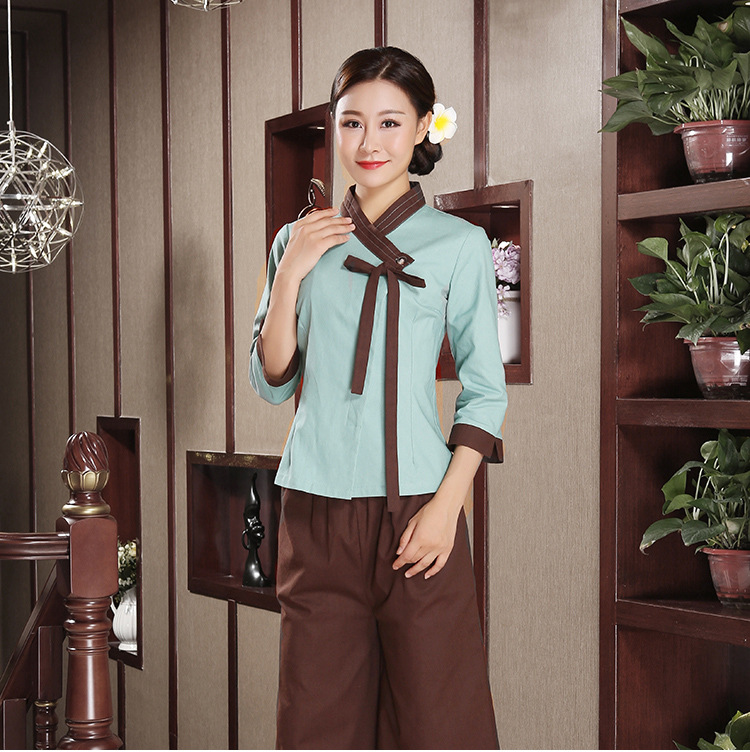 Baru Cina kelas atas gaya etnik spa wanita teknisi pakaian kerja Pusat Kesehatan ahli kecantikan setelan pedikur pijat teknisi pakaian