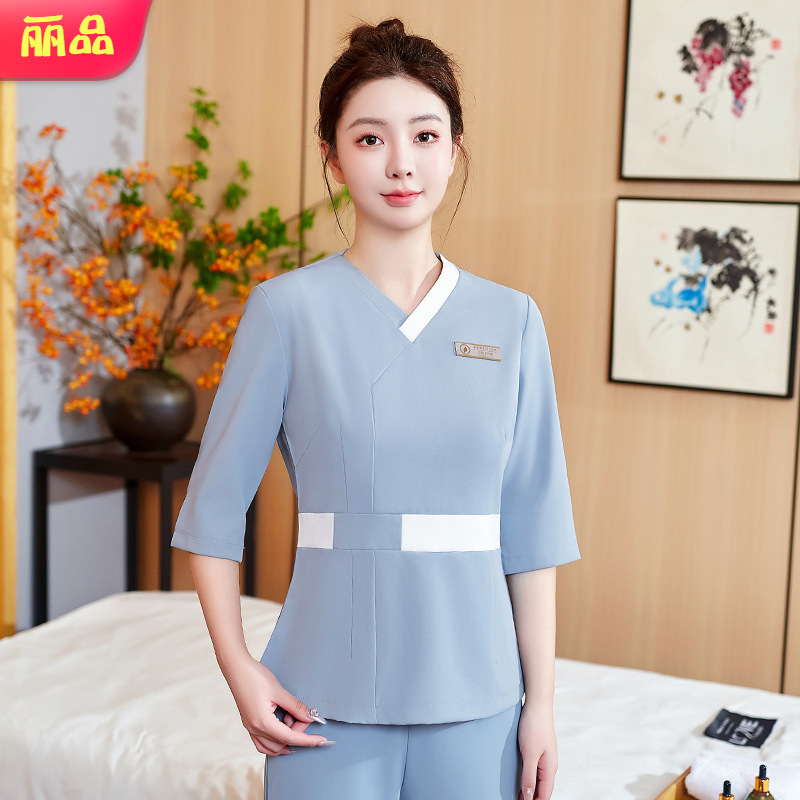 Setelan teknisi gaya baru slim fit dua potong seragam kerja kecantikan untuk klub malam, foot bath, sauna, dan keperluan kecantikan 5375 gaya kampus
