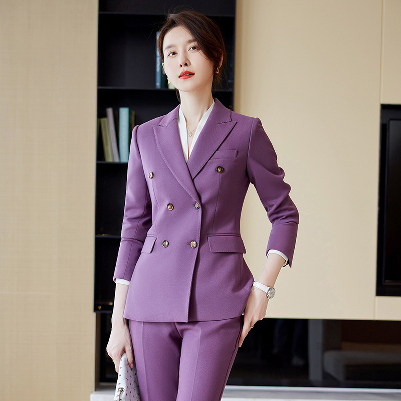 Pakaian bisnis baru musim gugur dan musim dingin 2023 setelan ungu wanita baju overall kecantikan kerah putih elegan pelangsing