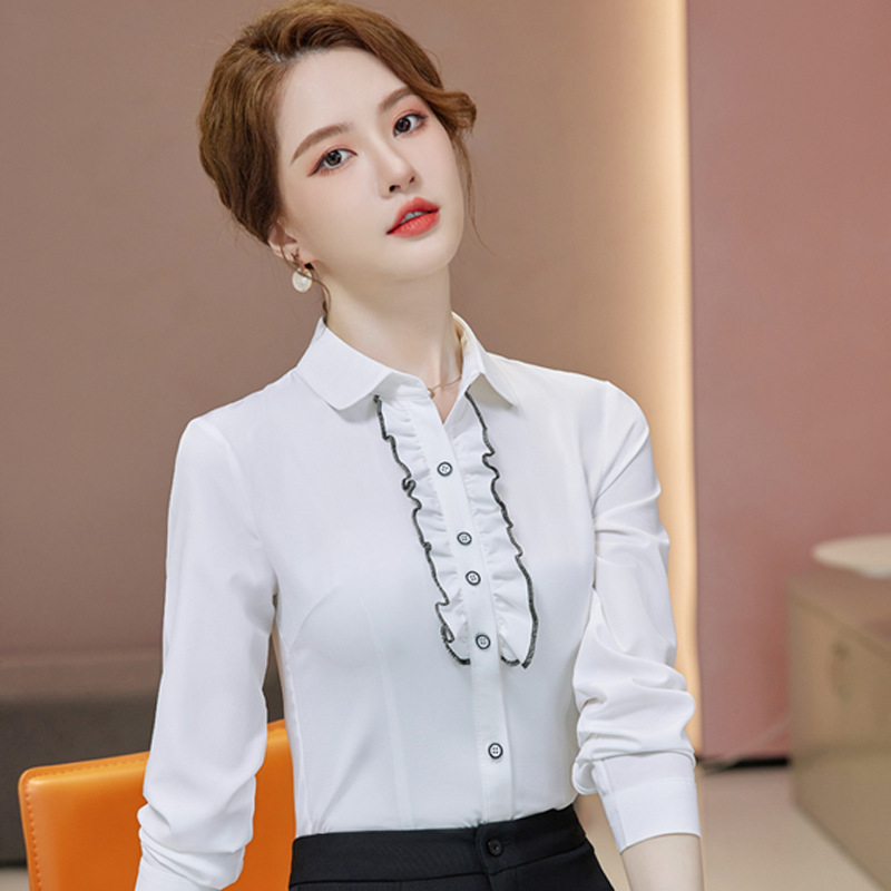Kemeja putih profesional wanita lengan panjang setelan perhiasan toko ahli meja depan kasir pakaian kerja