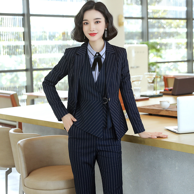 Pakaian bisnis wanita bergaris setelan pakaian formal rompi empat potong set ramping temperamen perhiasan kecantikan panduan belanja overall