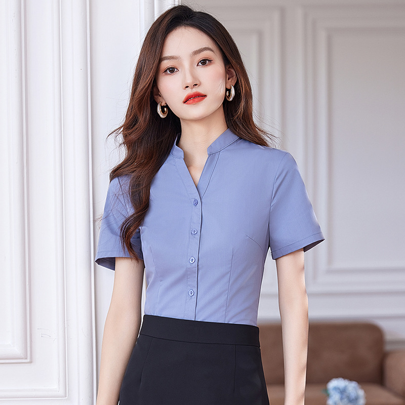 Baju kerja wanita pramugari kemeja putih baju kerja wanita leher V pas badan kemeja pramugari baju kerja toko perhiasan ahli kecantikan lengan pendek