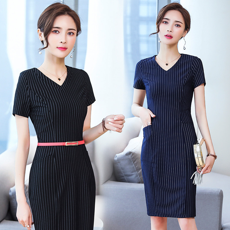 Gaun lengan pendek pelangsing profesional bergaris pakaian kerja klub kecantikan pakaian kerja toko perhiasan komuter temperamen elastis