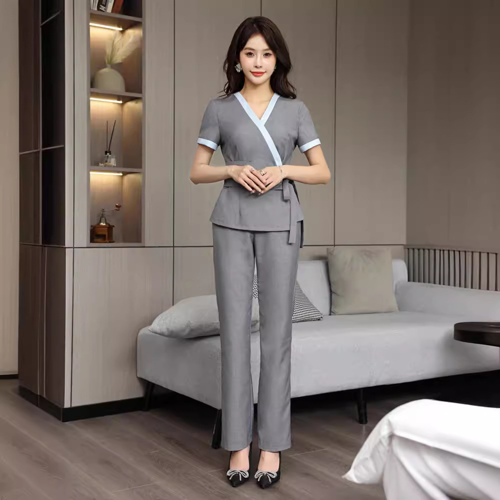 Pakaian kerja wanita cantik medis setelan lengan pendek wanita pakaian bisnis kecantikan perawatan kesehatan kelas atas pakaian bisnis penjualan wanita