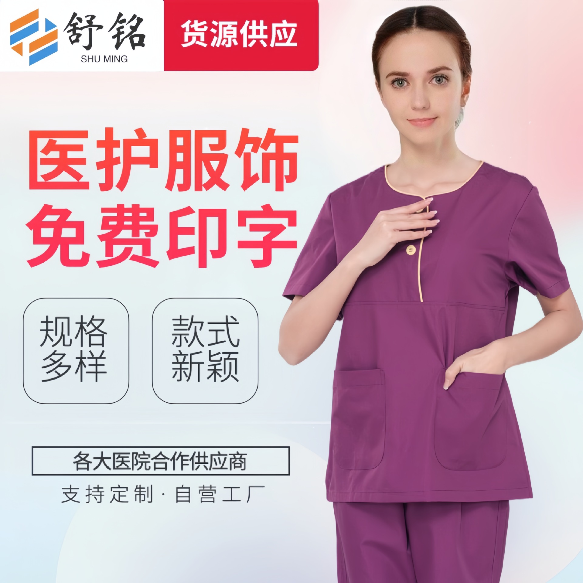 Pesan pabrik pakaian kerja medis baju cuci lengan pendek menyerap kelembapan bubuk kecantikan katun ungu musim panas grosir