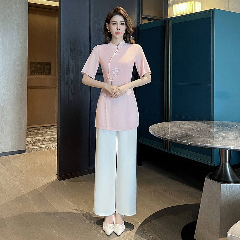 Pakaian Kerja Pijat Penutup Perut Setelan Cheongsam Modifikasi Gaya Tiongkok Sifon Salon Kecantikan Pakaian Teknis Mandi Kaki Wanita