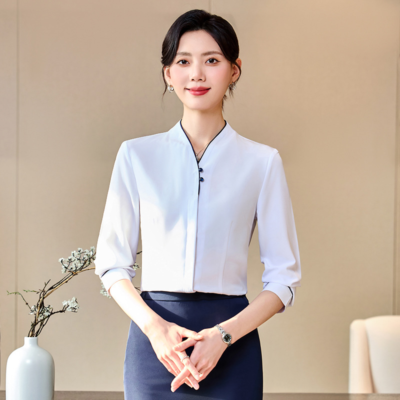 Kemeja Gaya Tiongkok Baru Wanita Model Baru 2025 Seragam Pramugari Pakaian Kerja Staf Meja Depan Hotel Kemeja Profesional