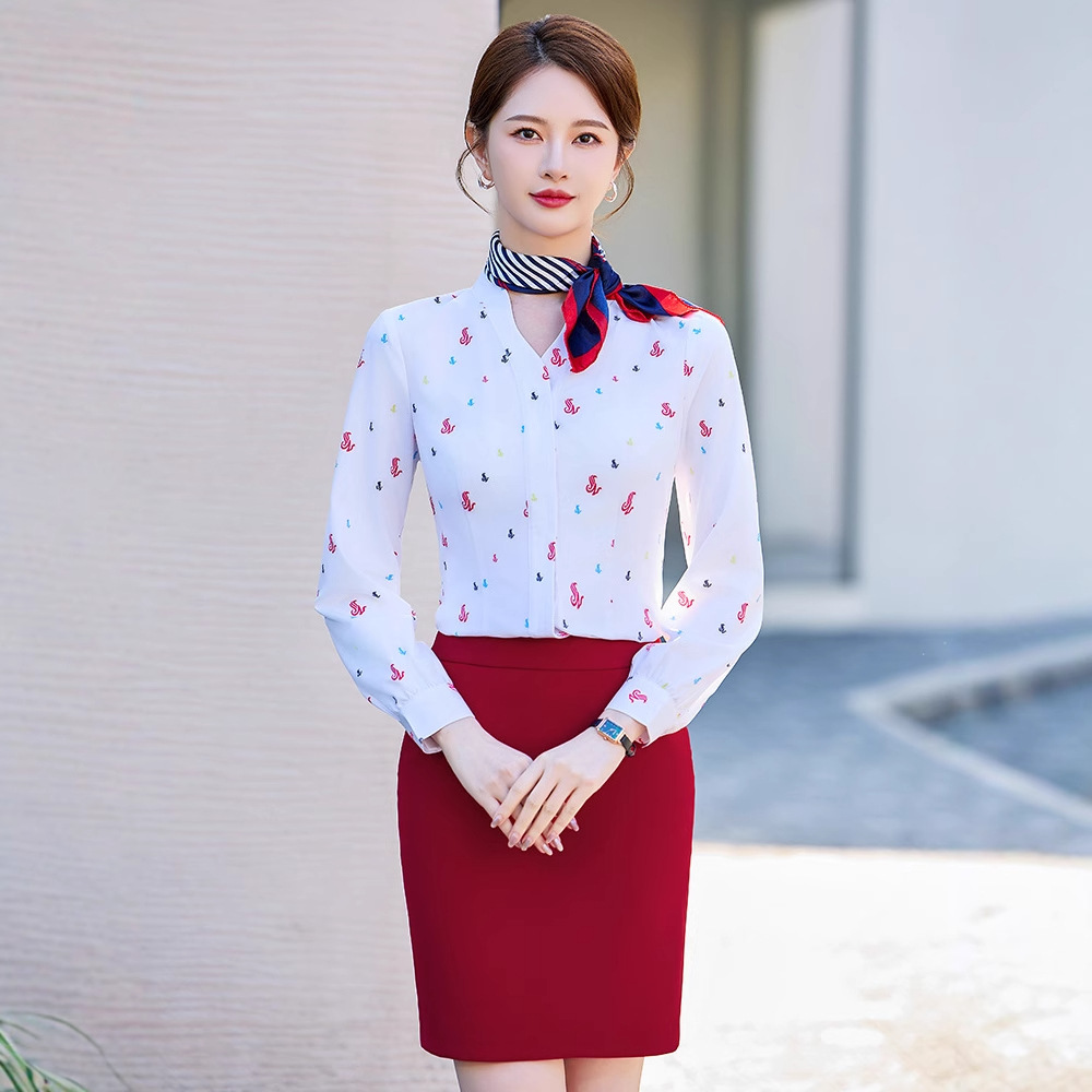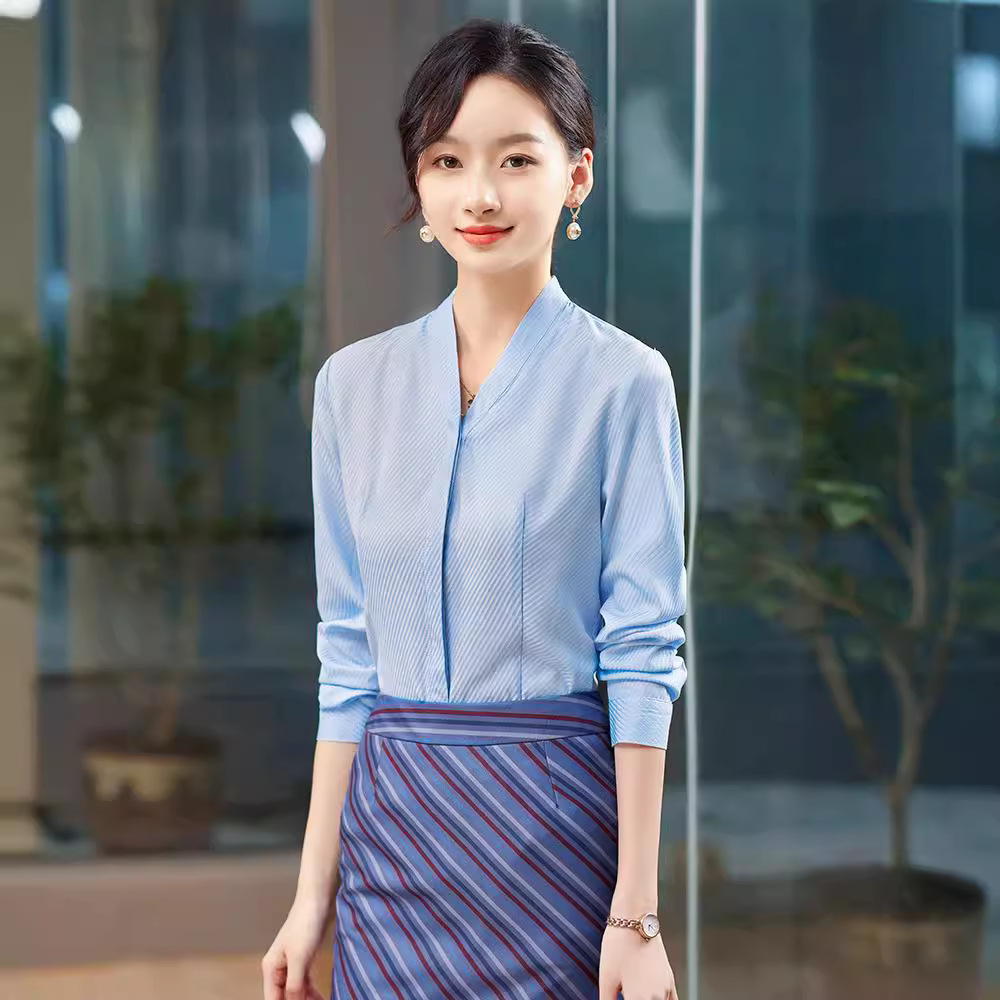 Setelan pakaian bisnis wanita, baju kemeja toko perhiasan, seragam pramugari leher V temperamen meja depan Musim Semi hotel