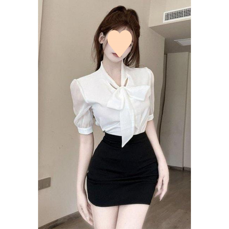 Kemeja Putih Kemeja Sifon Lengan Pendek Pakaian Kerja Seragam Pramugari Penerimaan Meja Depan Rok Set Wanita Elegan Profesional Musim Panas