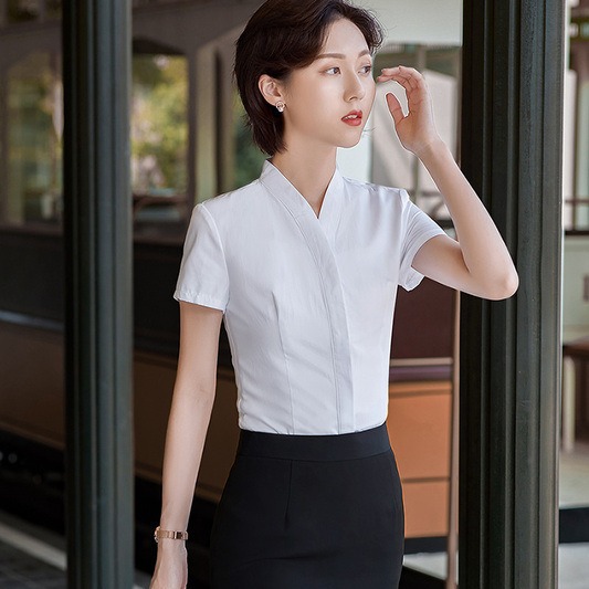 Kemeja Putih Profesional Pakaian Kerja Model Baru Musim Panas Pakaian Kerja Pramugari Pakaian formal Wawancara Pramugari Pakaian Kemeja Kerah V Set Seragam Pramugari
