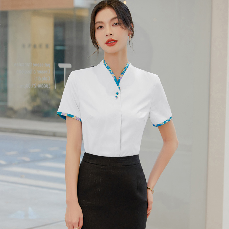 Kemeja putih wanita, perangai pramugari profesional untuk hotel depan meja salon kecantikan baju kerja lengan pendek musim panas