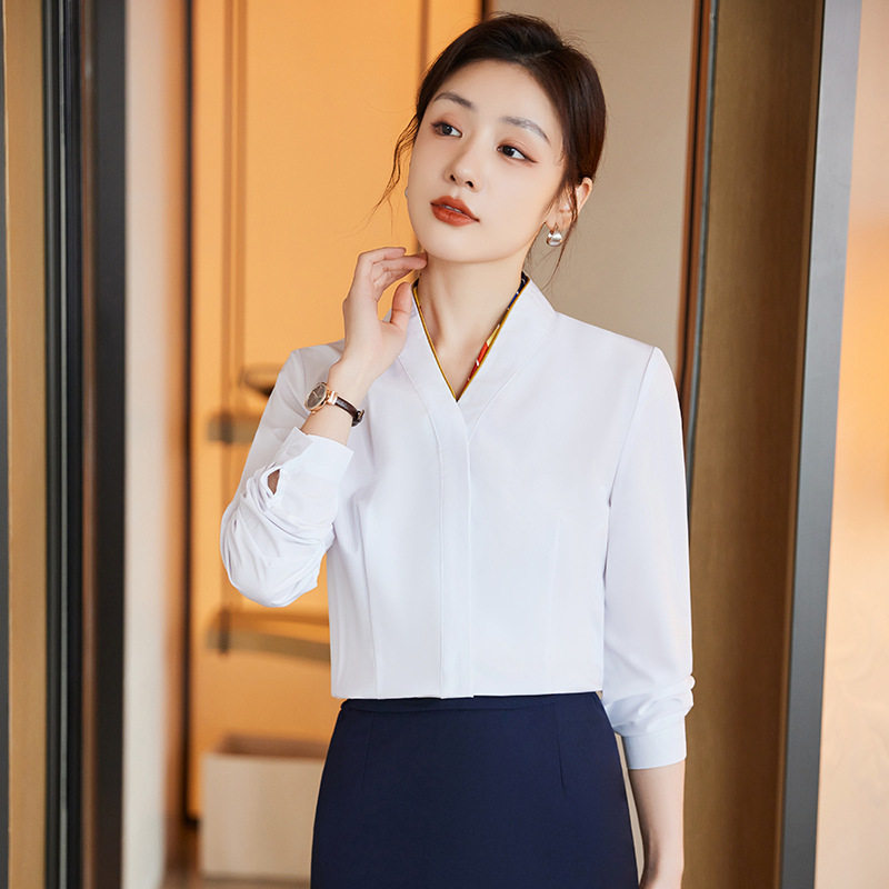 Kemeja putih lengan panjang China Southern Airlines pramugari rel berkecepatan tinggi pramugari penerbangan V-neck baju profesional wanita pakaian depan meja ahli kecantikan