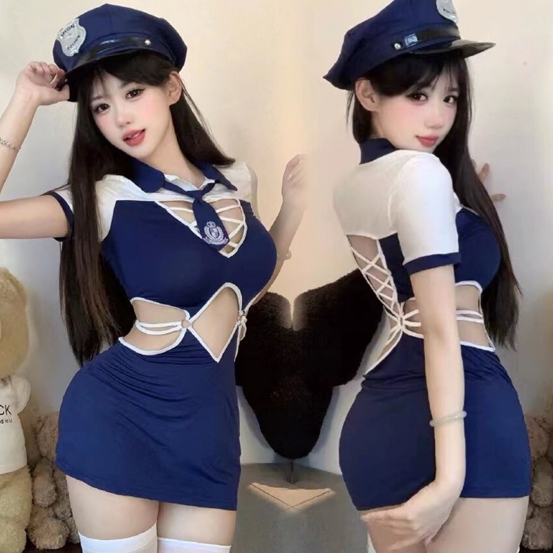 Lingerie seksi polwan peran bermain peran hot open hollow seragam one-piece menggoda pramugari setelan