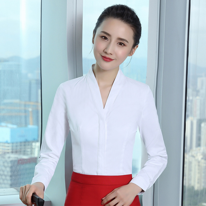 Baju kerja wanita kemeja putih, pakaian kerja wanita ukuran besar temperamen leher V, pakaian kerja pramugari wawancara formal seragam pramugari